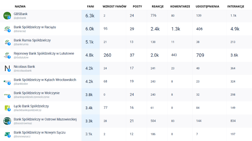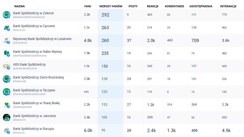 Warto zauważyć, że przyrosty nowych fanów w czterech pierwszych bankach były dość zbliżone. Większość z tych banków miała stosunkowo niewielką bazę fanów – w przedziale od 1 do 2,2 tys. obserwujących, z wyjątkiem Banku Spółdzielczego w Lututowie, który dysponował już większą bazą (4,8 tys. fanów).