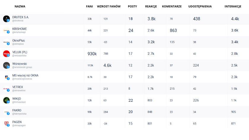 Największą zmianą w październiku był awans OknoPlus o dwa oczka w zestawieniu (z 5. miejsca we wrześniu, na 3. w październiku). Firma zdobyła 3,4 tys. interakcji, mimo odnotowania spadku o 200 interakcji w porównaniu do września (3,6 tys.).