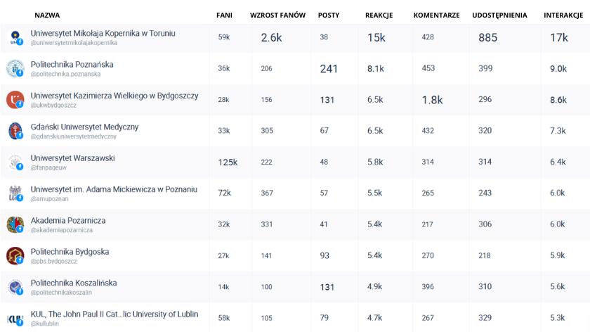 Najwyższy wynik w analizie osiągnął Uniwersytet Mikołaja Kopernika w Toruniu, który wygenerował 17 tys. interakcji. Co ciekawe, uczelnia opublikowała jedynie 38 postów, czyli najmniej spośród pierwszych 10 pozycji w zestawieniu. Mimo to, zgromadziła 15 tys. reakcji, 428 komentarzy oraz 885 udostępnień. Dodatkowo profil uczelni odnotował największy wzrost liczby fanów – aż o 2,6 tys., co może świadczyć o dużym zainteresowaniu publikowanymi treściami oraz skutecznym docieraniu do nowych odbiorców.