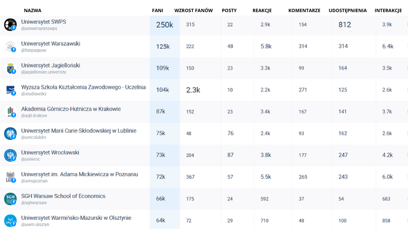 Największą bazę fanów w analizie posiadał Uniwersytet SWPS – 250 tys. obserwujących, jednak wygenerował tylko 3,9 tys. interakcji, co w zestawieniu dało wynik niższy niż w przypadku części uczelni z mniejszą społecznością (22. miejsce w ogólnym rankingu).