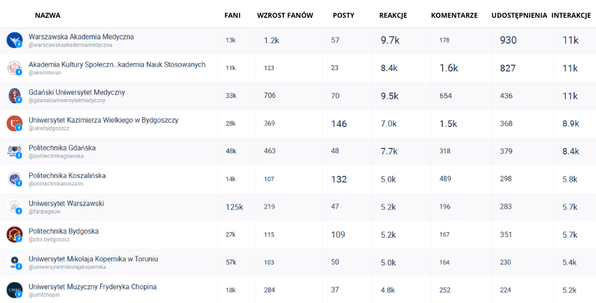 Pierwsze miejsce zdobyła Warszawska Akademia Medyczna, osiągając 10 850 interakcji przy 57 opublikowanych postach. Uczelnia zanotowała drugi co do wielkości wzrost liczby fanów (o 1,2 tys.). Interakcja z użytkownikami (średnio 190 interakcji na post) pokazuje, że jej komunikacja jest skuteczna i angażująca.