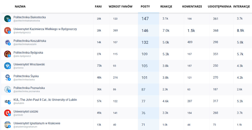 Niektóre profile uczelni wyższych były bardzo aktywne, publikując nawet ponad 100 postów w styczniu. Liderem pod tym względem okazała się Politechnika Białostocka, która opublikowała ich aż 147, ale uzyskała jedynie 3,7 tys. interakcji.