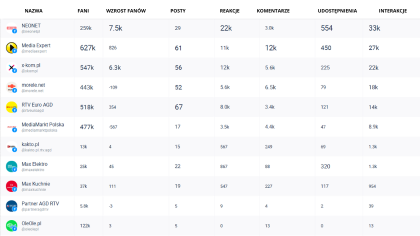 Podium zamyka x-kom.pl, uzyskując solidny wynik 22 tys. interakcji – to kolejno o 11 tys. i 5 tys. mniej niż marki NEONET i Media Expert. Firma opublikowała 56 postów, a średnia ilość interakcji na post wyniosła 393. Opublikowane materiały zdobyły 12 tys. reakcji, 5,6 tys. komentarzy i 225 udostępnień, a także przyczyniły się do pozyskania 6,3 tys. nowych fanów.