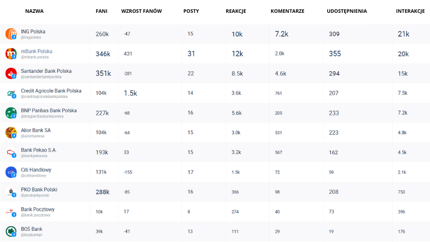 Bank wyróżnia się najbardziej aktywną komunikacją – opublikował aż 31 postów oraz osiągnął najwyższą liczbę reakcji i udostępnień.