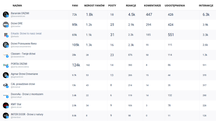 Barański DRZWI, z wynikiem 6,3 tys. interakcji, zajmuje pierwsze miejsce w rankingu. Firma opublikowała 18 postów (najmniej wśród liderów), które wygenerowały średnio 350 interakcji na post. Firma zdobyła największą ilość reakcji (4,5 tys.) oraz komentarzy (447). W październiku przyciągnęła 1,8 tys. nowych użytkowników, kończąc tym samym miesiąc z 72 tys. fanów.