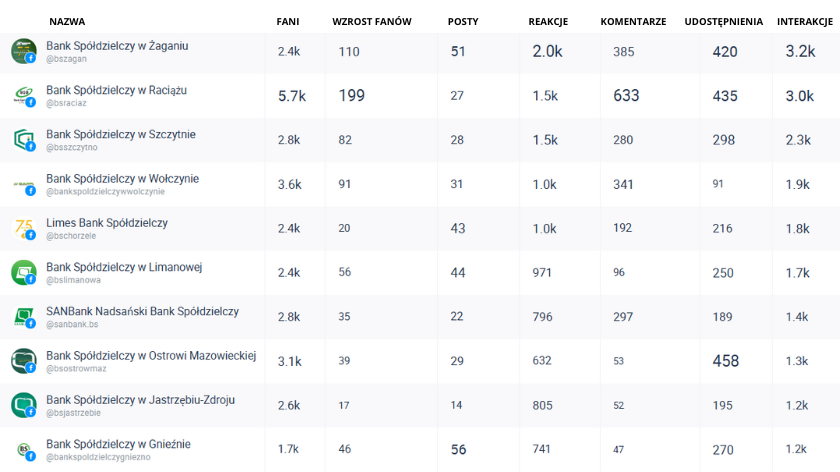 Na trzecim miejscu znalazł się Bank Spółdzielczy w Szczytnie, który zdobył 2,3 tys. interakcji. W ostatnim miesiącu opublikował 28 postów, które wygenerowały średnio 82 interakcje na post, co stanowi dobry wynik w relacji do liczby opublikowanych treści. Bank wyróżniał się stosunkowo wysoką liczbą reakcji (1,5 tys.), ale liczba udostępnień (298) oraz komentarzy (280) wskazuje na obszary, w których można jeszcze poprawić zaangażowanie.