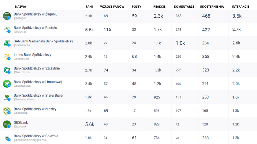Z analizy wyników wynika, że choć duża liczba postów publikowanych na Facebooku nie zawsze skutkuje efektywną komunikacją, warto zauważyć, iż 4 na 5 najbardziej aktywnych banków znajduje się w czołowej dziesiątce ogólnego rankingu pod względem liczby zdobytych interakcji. Wyjątkiem jest tylko Bank Spółdzielczy w Kowalu, który, mimo najwyższej aktywności, nie uplasował się w pierwszej dziesiątce ogólnego zestawienia.