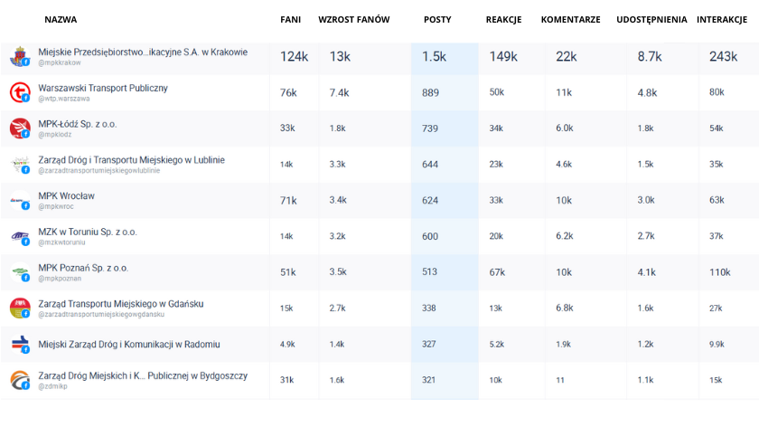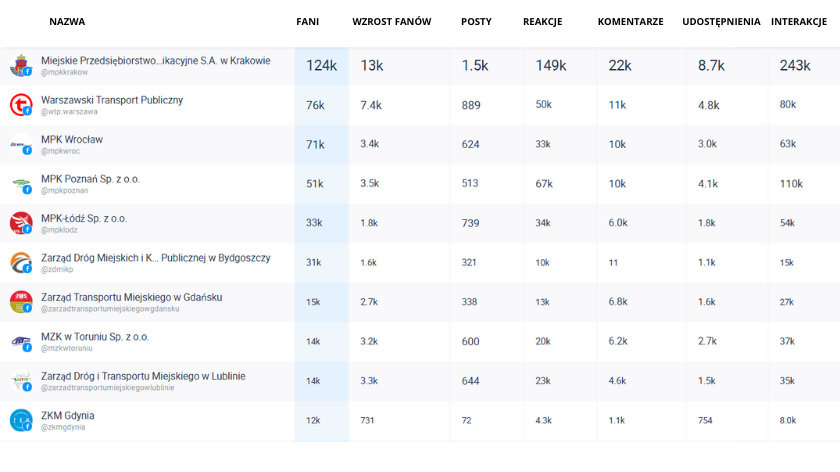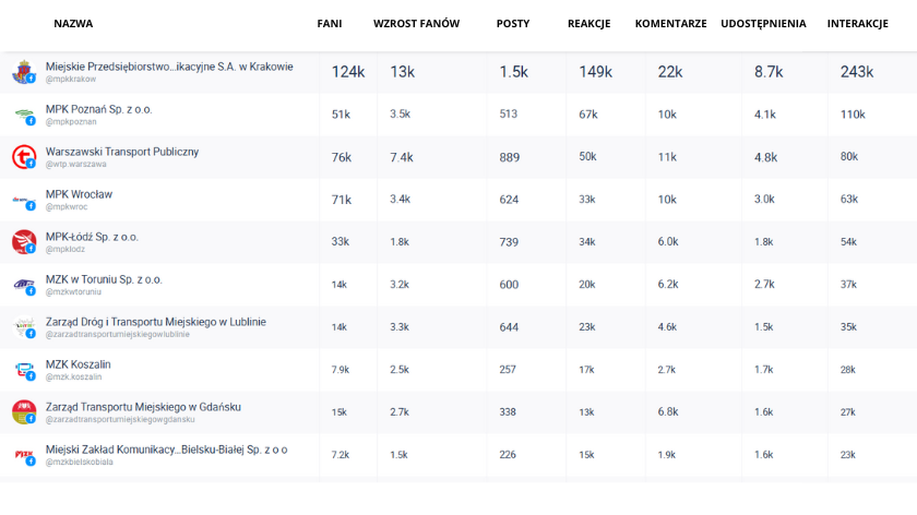 Wysokimi wynikami mogą pochwalić się także: Warszawski Transport Publiczny (76 tys. fanów, +7,4 tys.), MPK Wrocław (71 tys., +3,4 tys.) oraz MPK Poznań (51 tys., +3,5 tys.).