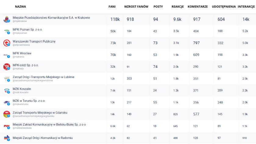 W sierpniu 2025 roku analitycy Instytutu Badań Internetu i Mediów Społecznościowych przeprowadzili analizę komunikacji na Facebooku 57 profili komunikacji miejskich w Polsce. Głównym wskaźnikiem efektywności komunikacji była liczba interakcji – suma reakcji, komentarzy i udostępnień.