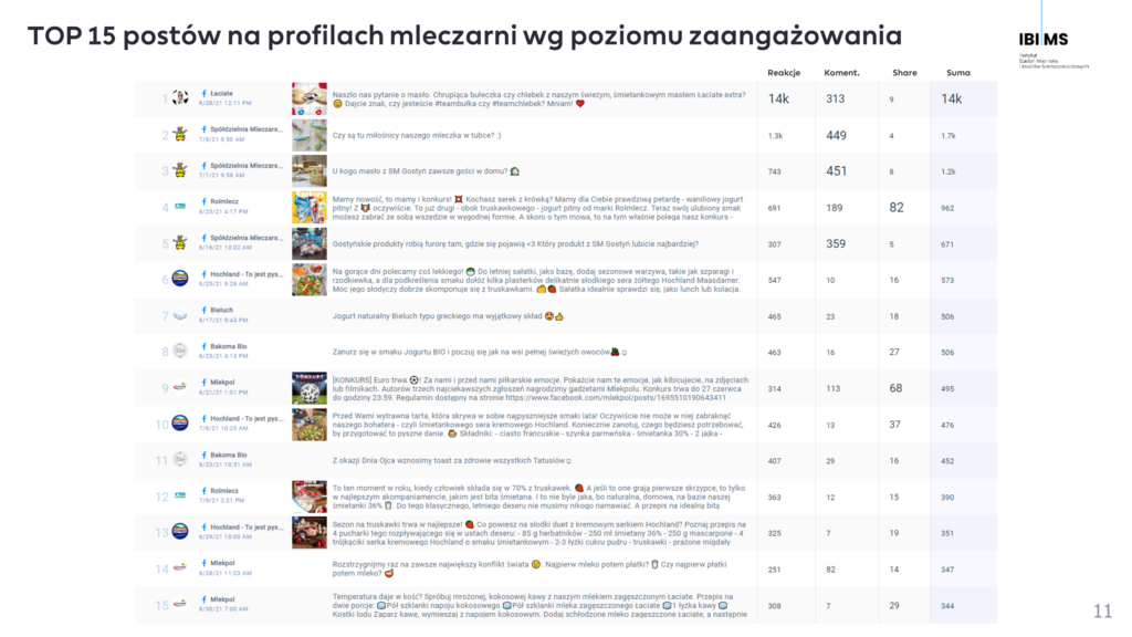 W TOP15 postów branży jest spora różnorodność – są tam posty Mlekopolu (3), SM w Gostyniu (3), Hochlandu (3 posty), Rolmlecz (2), Bakoma Bio (2) Łaciatego (1), Bieluch (1). Najpopularniejszym postem była wspomniana już publikacja Łaciatego.