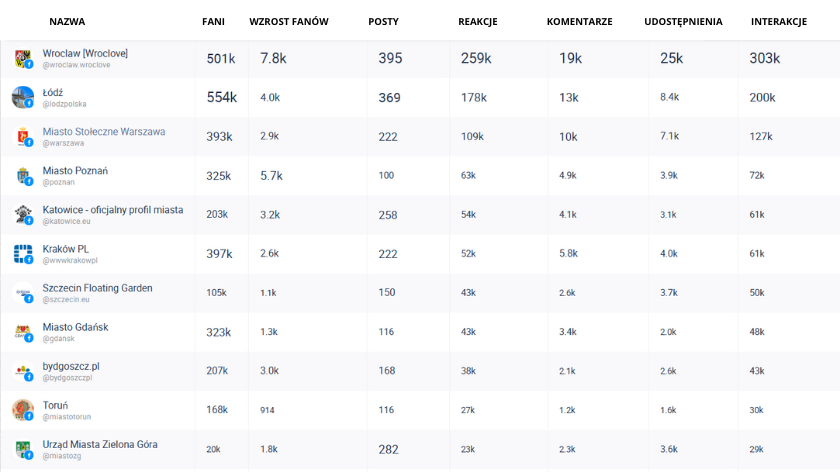 Po raz kolejny na pierwszym miejscu uplasował się Wrocław. Miasto osiągnęło 303 tys. interakcji, publikując 395 postów, co daje średnio około 767 interakcji na post. Wrocław zdominował ranking również pod względem liczby reakcji (259 tys.), komentarzy (19 tys.) oraz udostępnień (25 tys.). We wrześniu miasto przyciągnęło 7,8 tys. nowych fanów, osiągając bazę na poziomie 501 tys. obserwujących.