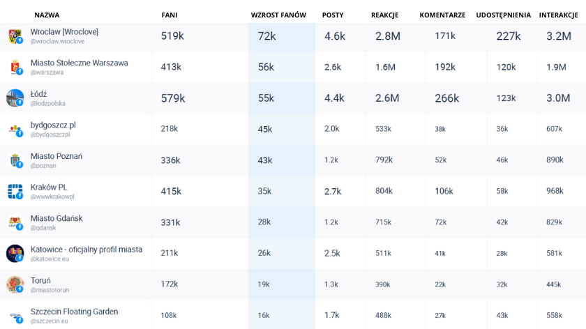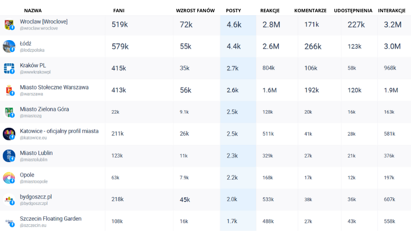 Warszawa, mimo że z wynikiem 1,9 mln interakcji znalazła się na trzecim miejscu, utrzymuje solidną obecność na Facebooku. Miasto zyskało 56 tys. nowych fanów, a liczba postów wyniosła 2,6 tys. Średnia liczba interakcji na post wyniosła 731, co, pomimo mniejszej liczby postów, świadczy o skutecznej i trafnej komunikacji, szczególnie w zakresie reakcji (1,6 mln) oraz komentarzy (192 tys.).