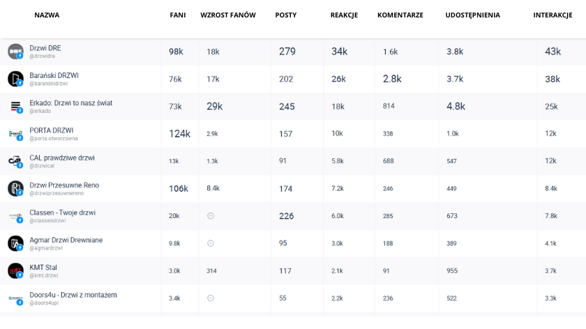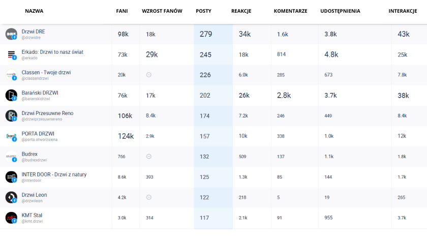 Podobny mechanizm widać także w przypadku profili takich jak Budrex, INTER DOOR, Drzwi Leon czy KMT Stal – należą one do bardziej aktywnych w zestawieniu, jednak nie przełożyło się to na odpowiednio wysoką liczbę interakcji, przez co nie znalazły się w top 10 rankingu ogólnego.