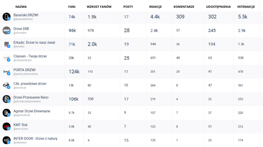 Instytut Badań Internetu i Mediów Społecznościowych (IBIMS) przeprowadził analizę komunikacji firm zajmujących się produkcją drzwi na Facebooku. Podobnie jak w poprzednich miesiącach, głównym wskaźnikiem efektywności pozostaje liczba interakcji, czyli suma reakcji, komentarzy oraz udostępnień — kluczowa miara zaangażowania użytkowników.