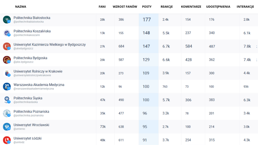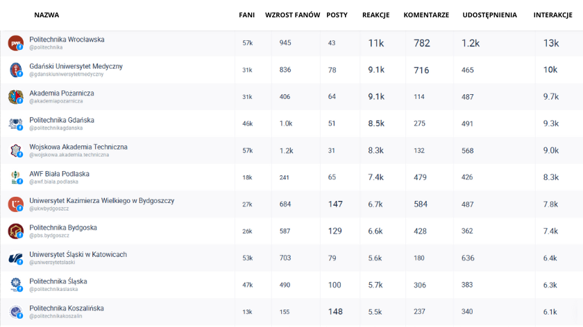 Politechnika Wrocławska zdecydowanie przoduje w zestawieniu, osiągając 13 tys. interakcji przy 43 postach. Uczelnia jest liderem również pod względem zdobytych reakcji (11 tys.), komentarzy (782) oraz udostępnień (1,2 tys.). Na uwagę zasługuje również wzrost bazy fanów o 945 osób, co plasuje uczelnię na 4. miejscu pod względem przyrostu fanów. Politechnika Wrocławska wykazuje się także dużą efektywnością, uzyskując średnio 302 interakcje na post, co stanowi jeden z najwyższych wyników w tej kategorii.