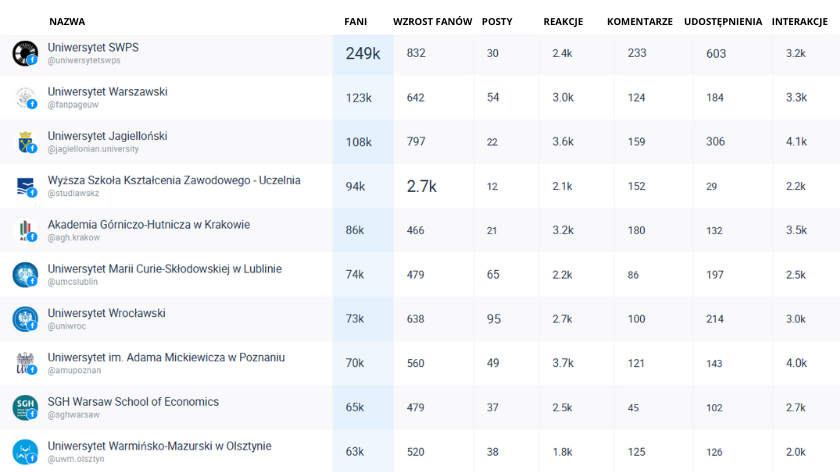 Baza fanów to jeden z kluczowych wskaźników, który obrazuje potencjał dotarcia do szerokiej grupy odbiorców. Z analizy wynika, że choć Uniwersytet SWPS i inne wymienione uczelnie dysponują dużą bazą fanów, żadna z nich nie znalazła się w pierwszej dziesiątce ogólnego rankingu, który uwzględniał liczbę interakcji. To pokazuje, że sama liczba fanów nie wystarcza, by osiągnąć wysokie zaangażowanie w mediach społecznościowych.